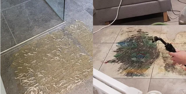Виявилося, що килимок для душу розплавився на підлозі й залишив по собі гумові білі нитки, що сильно нагадують черв'яків. Карина попросила допомоги у соцмережах, оскільки не знала, як видалити гуму з плитки. Вона опублікувала фото своєї проблемної ситуації у Facebook, запитавши: "Як би ви вчинили у такій ситуації?".
