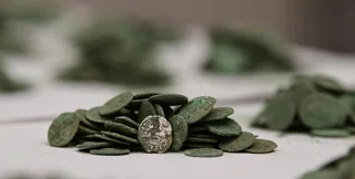 На фотографіях показані купи потьмянілих, синьо-зелених монет. Одна з них очищена, срібляста та блискуча, сяє на тлі навколишньої купи. На ній по центру зображено фігуру, що тримає щось у кожній руці, і кільце тексту по краю.