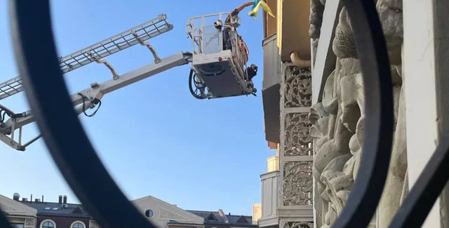 Спочатку співробітники МНС намагалися зняти прапор за допомогою пожежної драбини, але її довжини не вистачило. Довелося викликати кран.