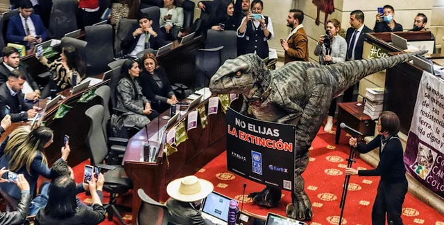 У парламенті Колумбії динозавр розповів парламентарям про кліматичну кризу у світі. Про це написала 14 червня іспанська газета Vanguardia.
