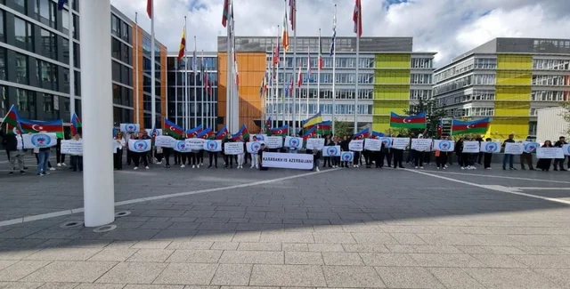 Учасники мітингу скандували: "Карабах" і "AZfront". Вони тримали плакати з гаслами англійською та французькою мовами: "Карабах — це Азербайджан!", "Карабах — міжнародно визнана територія Азербайджану!".