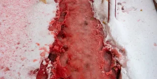 Окрім моторошних "прикрас" на будинку у місті з’явилися замерзлі "ріки крові" на тротуарах. Місцеві жителі підозрюють, що у жахітті треба винити майстрів, які ремонтували дах.