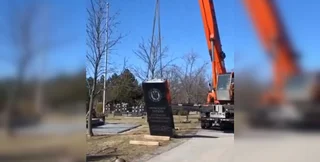 На відео видно, що до пам'ятника під'їхав кран, який прикріпив троси до скоб на мармуровій поверхні. Після цього масивний об'єкт повільно опустили на дошки. Що далі зробили з монументом, не ясно — запис обривається.