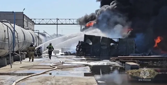 Цистерни, що палають, гасять два пожежні поїзди і майже 60 осіб від МНС РФ. Причину масштабної пожежі не уточнюють.