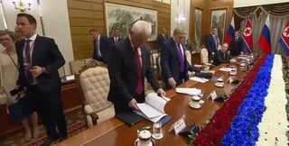 Північнокорейський чиновник вигнав російських міністрів, які зайшли в зал засідань раніше за Кім Чен Ина. Те, що сталося, потрапило на пряму трансляцію північнокорейського телеканалу. Так, із залу вигнали главу МЗС Лаврова, міністра оборони Бєлоусова, міністра охорони здоров'я Мурашка, главу Роскосмосу Борисова, першого віцепрем'єра Мантурова і віцепрем'єра Савельєва. На відео також чутно, як голос з акцентом каже: "Вийдіть у хол". Хтось із російських міністрів запитує: "А навіщо ми сюди зайшли? Ви б одразу попередили".