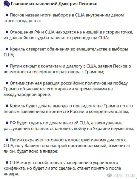 11:45 У Кремлі відреагували на події в США, де республіканці почали святкувати перемогу на президентських виборах та на виборах в Конгрес, розповіло російське агентство ТАСС. Речник президента РФ Дмитро Пєсков заявив на брифінгу, що не знає, чи буде Володимир Путіна вітати Дональда Трампа, але наголосив, що той "відкритий до діалогу" і може зателефонувати. Крім того, посадовець пояснив, що у Москві радіють успіхам республіканця, оскільки росіянам подобаються його мирні ініціативи. Втім, предметні розмови на тему російсько-української війни Кремль відкладає на січень, коли відбудеться інавгурація, сказав Пєсков.