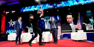 Маск у своїй фірмовій чорній кепці з написом "Зробимо Америку Знову Великою" почав свій виступ на конференції. Мілей у цей час зайшов на сцену і передав мільярдерові бензопилу.