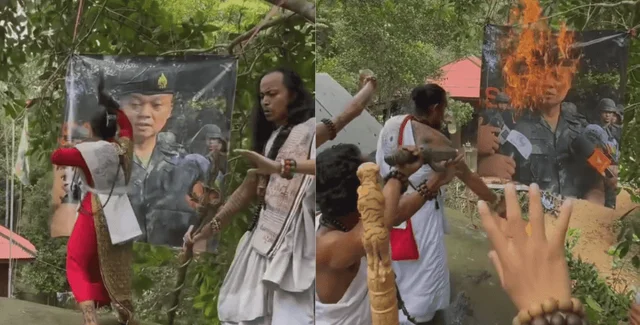 Як уточнює видання, це була "складна церемонія із символічним насильством". Дійство закінчується тим, що фото Бунсіна Пхаткланга спалюють.