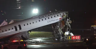Літак Air Canada CRJ-900 зіткнувся з транспортним засобом на злітно-посадковій смузі після посадки. На фото з місця інциденту видно, що літак зазнав значних пошкоджень.