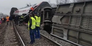 На відео з місця пригоди можна побачити пасажирів, які стоять навколо перекинутих вагонів.