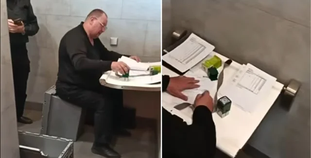 На ньому видно чоловіка, який, ймовірно, у вбиральні щось записує у документах. У 30-секундному фрагменті він говорить: