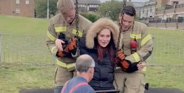 Сміялися всі: молоду маму, яка застрягла в дитячій гойдалці, врятували пожежники (фото)