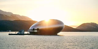 Плавуча будівля The Salmon Eye, розташована в глушині, у норвезькому Хардангерфіорді, являє собою величезну сріблясту сферу посеред води, усередині якої є особливий ресторан Iris. У ньому подають страви з інгредієнтами, "схожими на інопланетні". Серед них міцелій, ламінарія та водорості. Про це пише Daily Star.