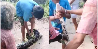 На короткому записі показано, як старший чоловік з хлопчиком тримають величезну змію за хвоста. За кадром чути занепокоєні вигуки місцевих жителів, які прийшли подивитися на їхню роботу. У якийсь момент дитина спробувала схопити змію за шию і, на диво, їй це вдалося. Після цього вони витягують пітона на ґрунтову дорогу й засовують у пакет.