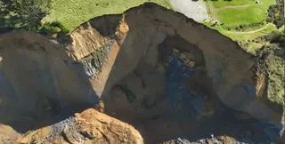 На кадрах із безпілотника, опублікованих на YouTube 25 лютого, видно, як двоє людей біжать паркуванням геть від зсуву ґрунту, тоді як скеля руйнується лише за кілька футів від того місця, де вони стояли.
