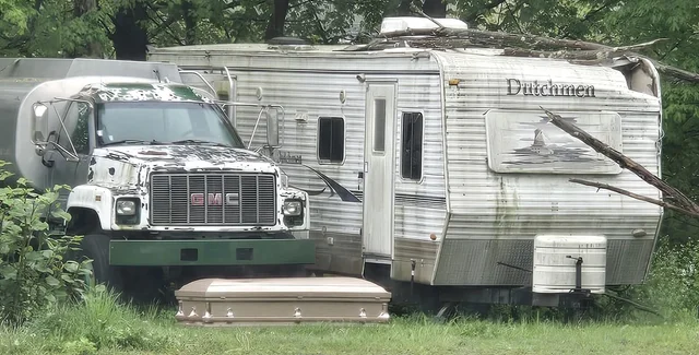 Оповідачка прикріпила до допису фото, на якому зображені старий будинок на колесах і великий автомобіль, а поруч із ними стоїть бежева труна. Жінка зазначила, що вона вже тиждень стоїть на чужій ділянці й має абсолютно новий вигляд. За її словами, вона б зазирнула всередину, але боїться проникати на чужу власність.