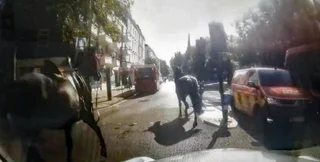 На кадрах відеореєстратора, водія таксі видно, як коні біжать вулицями. І один із них врізається в його машину.