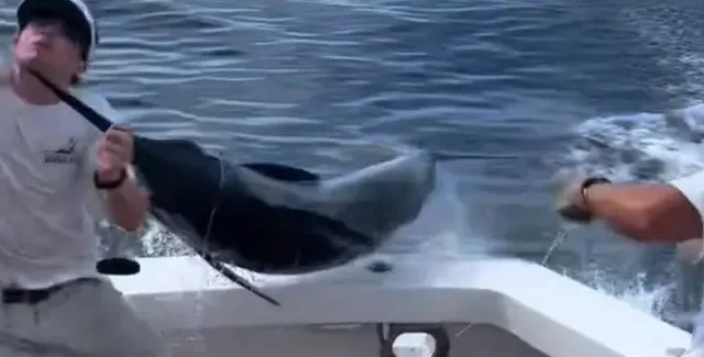 У короткому відео можна побачити, як один із семи чоловіків на борту судна дістає свій улов, а тим часом велетенський блакитний марлін виринає з води, намагаючись звільнитися від волосіні, й хапає за шию іншого члена експедиції — у білій сорочці та кепці. Чоловік впав на палубу, почав панікувати й кричати від нестерпного болю.