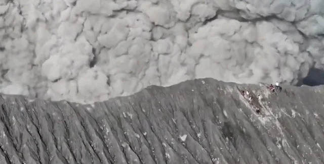 На відео видно, як туристи, крихітні на тлі величезного кратера вулкана Дуконо, копошаться на схилі, намагаючись сховатися від гігантської хмари газу і попелу, яка наближається до них із приголомшливою швидкістю.