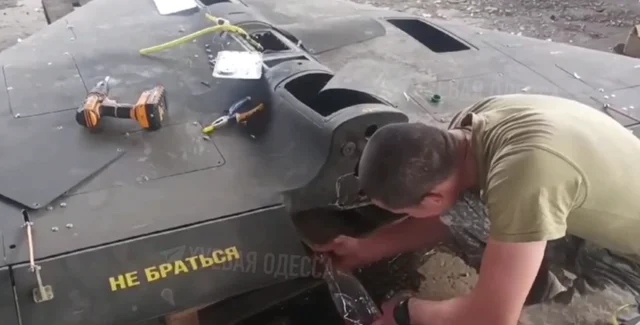 Один з українських військових зняв відео, як його колега сидить навпочіпки біля корпусу планера російського ударного БПЛА й намагається відкачати пальне із паливного бака безпілотника.