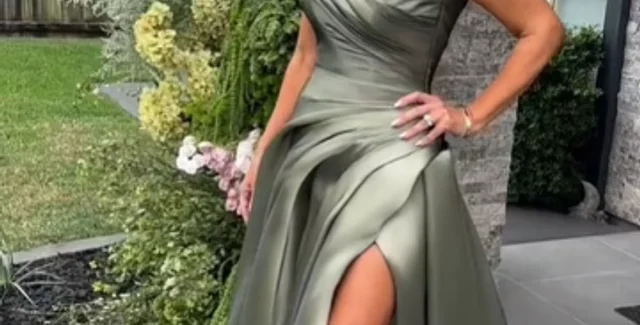 На короткому ролику помітно, що мама нареченої гуляє перед будинком у приголомшливій оливково-зеленій сукні, яку виготовили на замовлення дизайнерки високої моди Джорджини Марі. А в одному з кадрів помітно, що жінка показує стегно та висуває ногу назовні, щоб продемонструвати сміливий розріз сукні.