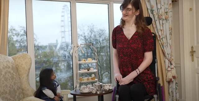 У лондонському готелі The Savoy відбулася незвичайна зустріч — найнижча жінка світу, 30-річна Джіоті Амге з Індії (зріст 63 см), вперше зустрілася з найвищою жінкою планети, 27-річною Румейсою Гелгі з Туреччини (зріст 215 см). Про це пише The Sun.