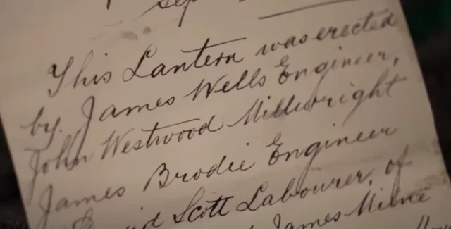 "Цей ліхтар був зведений інженером Джеймсом Веллсом, фрезерувальником Джоном Вествудом, інженером Джеймсом Броуді, робітником Девідом Скоттом із фірми "Джеймс Мілн і син інженери", завод Мілтон Гаус, Единбург, упродовж місяців із травня до вересня і знов запалений у четвер увечері 15 вересня 1892 року. У цей час на станції працювали такі доглядачі: Джон Вілсон — директор, Джон Б. Хендерсон — 1-й помічник, Джон Локхарт — 2-й помічник. Лінза і машина були поставлені Джеймсом Доувом і компанією "Інженери Грінсайд Едінбург" і зведені Вільямом Бернесом, Джоном Гарровером, Джеймсом Додсом. Інженери вищезгаданої фірми", — свідчила записка.