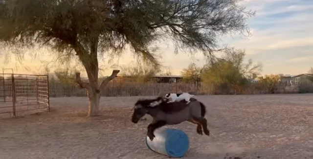 На кадрах можна побачити, як тер'єр "сидить" на спині поні, коли кінь готується розбігтися та стрибнути через синю пластикову бочку. За кілька секунд поні розбігається і перестрибує разом з собакою на спині цю перешкоду.