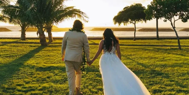 Молодята вирішили провести церемонію на Гавайських островах: вони обмінялись обручками, станцювали та зіграли на традиційному музичному інструменті.