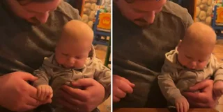 У відео, опублікованому в TikTok, батько тримає на колінах новонародженого сина, грайливо ворушачи пальцями по столі, наче біжить ніжками, а потім турботливо гладить малюка.