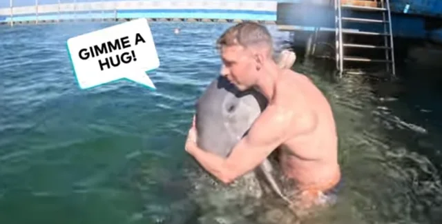 Один з мешканців дельфінарію вирішив обійняти відвідувача, який спустився у басейн для контакту зі ссавцем. Дружелюбного дельфіна похвалили усі коментатори і теж заявили, що були б не проти таких обіймашок.