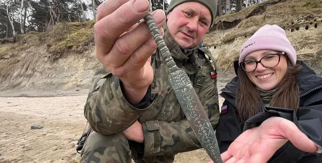 На узбережжі Балтійського моря в Польщі пара відпочивальників виявила унікальний артефакт — стародавній кинджал віком близько 2500 років. Знахідка була зроблена Яцеком Уковскі та Катажиною Хердзік під час прогулянки пляжем. Зброя містилася в глиняному кургані, який, як припускають, обрушився зі скелі після недавніх штормів.