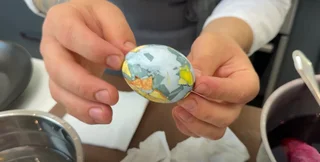 Перший варіант — найцікавіший. Яйця, пофарбовані у такий спосіб, нагадують глобус в мініатюрі, де можна розглядати материки та океани. Звісно, доведеться трохи попрацювати, але результат того однозначно вартий.