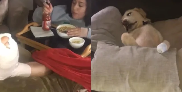 Коли Алексія Гусман з американського міста Буффало (штат Нью-Йорк, США) відновлювалася після операції на нозі, вона очікувала тиші та спокою. Замість цього вона отримала підтримку "з елементами театру". Її цуценя на прізвисько Уснаві вирішило, що страждати потрібно разом, і "пошкодило" лапу, приєднавшись до господині на лікарняному ліжку.