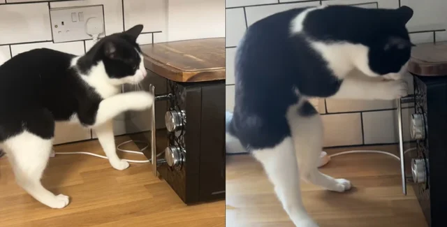 Кадри, опубліковані його господинею під ніком @caits182, показують, як пухнастий гість кухні енергійно дряпає дверцята мікрохвильової печі, поки ті не піддаються.