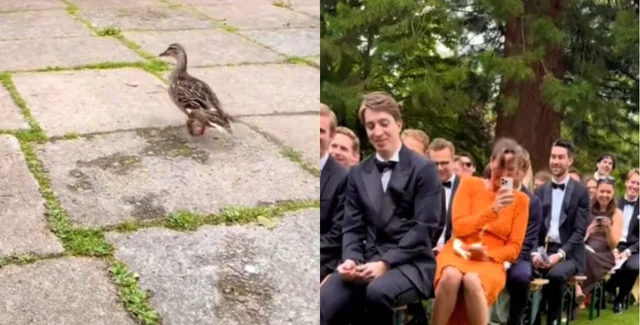 Ця чарівна подія відбулася в "гарному саду на місці проведення, де були встановлені лавки та квіти". Коли гості розсілися та чекали музики для виходу весільної процесії, один із гостей помітив, як качка йде алеєю.