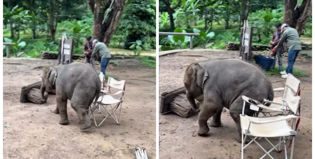 У Центрі для захисту і догляду за слонами Tusker Shelter, розташованому в Таїланді, місцеві доглядачі зафільмували кумедні кадри: маленький слон намагався сісти на розкладний стільчик. Та всі спроби малюка завершилися фейлом, після чого тварина вирішила "розквитатися" з ним.