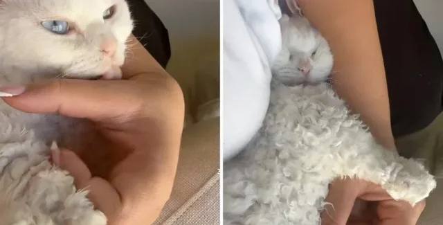 На кадрах, якими власниця поділилася із користувачами соцмереж, Фета притискається до її руки. При цьому кішка демонструє свою кучеряву білу шерсть, яка зацікавила людей.