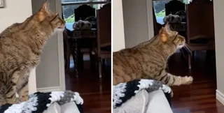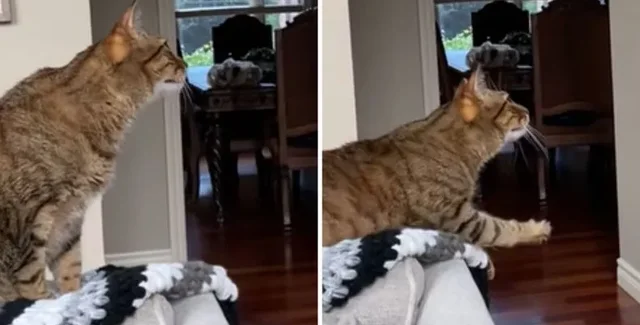 На кадрах кіт дивиться на фотографію на стіні, на якій зображений покійний собака Роккі. Тварина пильно вдивляється у зображення собаки, не відводячи погляд. Перед цим Луї виліз на диван та підсунувся на його край, аби якомога ближче бачити Роккі.