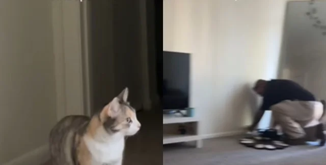 Колаж Фокус | реакція кішки на появу чужого чоловіка в домі