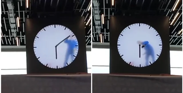 Насправді це ілюзія задуму митця. Цей годинник демонструє 12-годинне відеозаписування художника, яке постійно повторюється, щоб завжди показувати правильний час.