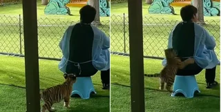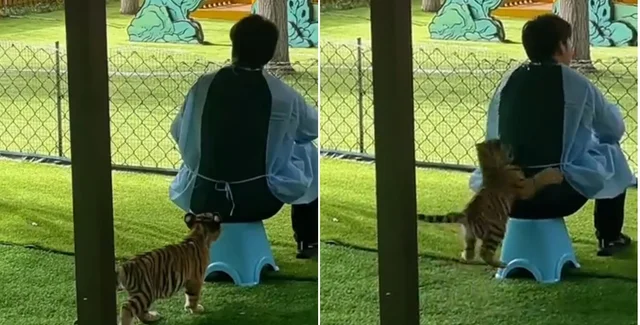 Коли пухнастий вивірено підкрався до чоловіка, тоді він здійснив свою "атаку" — стрибнув на спину мешканця Китаю. Наглядач оцінив навички тигреняти через кілька секунд, а потім узяв малого на руки.