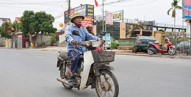 Сам пан Гуєн на мопеді й акуратно одягається, просовуючи руки в рукави за допомогою дружини Ті Тхуан, яка допомагає йому й у роботі.