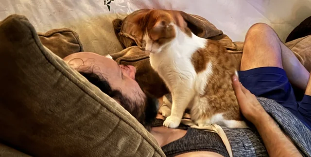 Усе змінилося після того, як Раян дістав серйозну травму ока і опинився вдома на тривалому відновленні. Остін розповіла, що кіт ніби відчув біду: з першого дня він сидів у нього на грудях, втішав і муркотів, допомагаючи впоратися зі страхом і болем.
