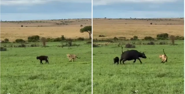 В одному з заповідників Африки турист помітив левовий прайд, який намагався вполювати дитинча буйвола. У відповідь дорослий рогатий кинувся в атаку проти цілої групи котячих, чим вразив мережу.