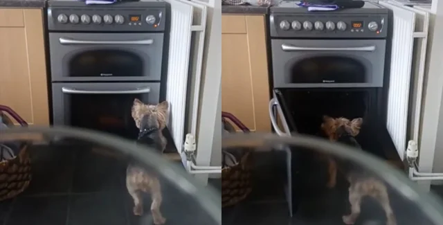 На записі видно, як два його йоркширські тер’єри — Альфі та Поппі — працюють у парі. Щойно господар виходить із дому, Альфі відкриває дверцята духовки, але відступає, бо їжа ще гаряча. Тут підходить Поппі, перевіряє, чи охололо — і саме в цей момент Рассел повертається й ловить їх "на місці злочину".