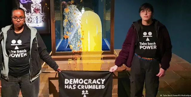 Четверо осіб закидали яблучним пирогом вітрину, в якій зберігається корона Британської імперії. Після цього на скло ще й вилили заварний крем.