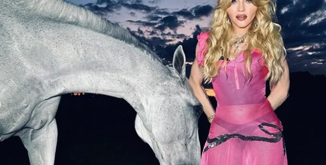 66-річна ікона стилю Material Girl опублікувала цілу серію фотографій, на багатьох з них вона прогулюється у відвертих вбраннях зі своїм конем на прізвисько Роллер. Виконавиця хітів, яка нещодавно закрутила новий роман з 28-річним Акімом Моррісом, 28 років, позує в прозорій яскраво-рожевій сукні, чорному корсеті, панчохах у сіточку і ковбойських чоботях на тлі сонця, що заходить. Для фотосесії Мадонна розпустила свої світлі локони і нанесла яскравий макіяж, який підкреслював її неймовірно гладкий колір обличчя. Також вона опублікувала кілька знімків з букетом рожевих квітів і стильну чорно-білу фотографію всередині самого будинку.