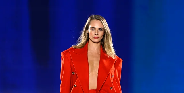 Кара Делевінь вийшла на подіум у розкішному червоному пальті (фото)