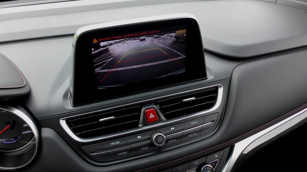 Зате тут великий центральний сенсорний дисплей, за допомогою якого можна управляти основними налаштуваннями авто і аудіосистемою, сюди ж виводиться картинка з камери заднього виду і сигнали парктроніків. Є синхронізація зі смартфоном, а ось ніші, яка підходить за розмірами для iPhone Max, не знайшлося, і телефон постійно "випирав" з відділення, ризикуючи випасти під час різкого маневру.